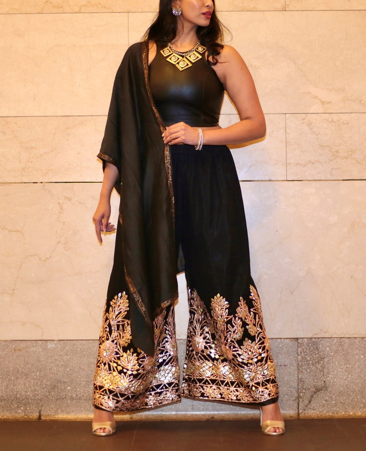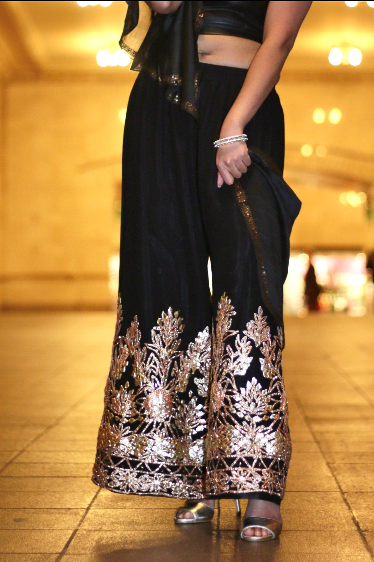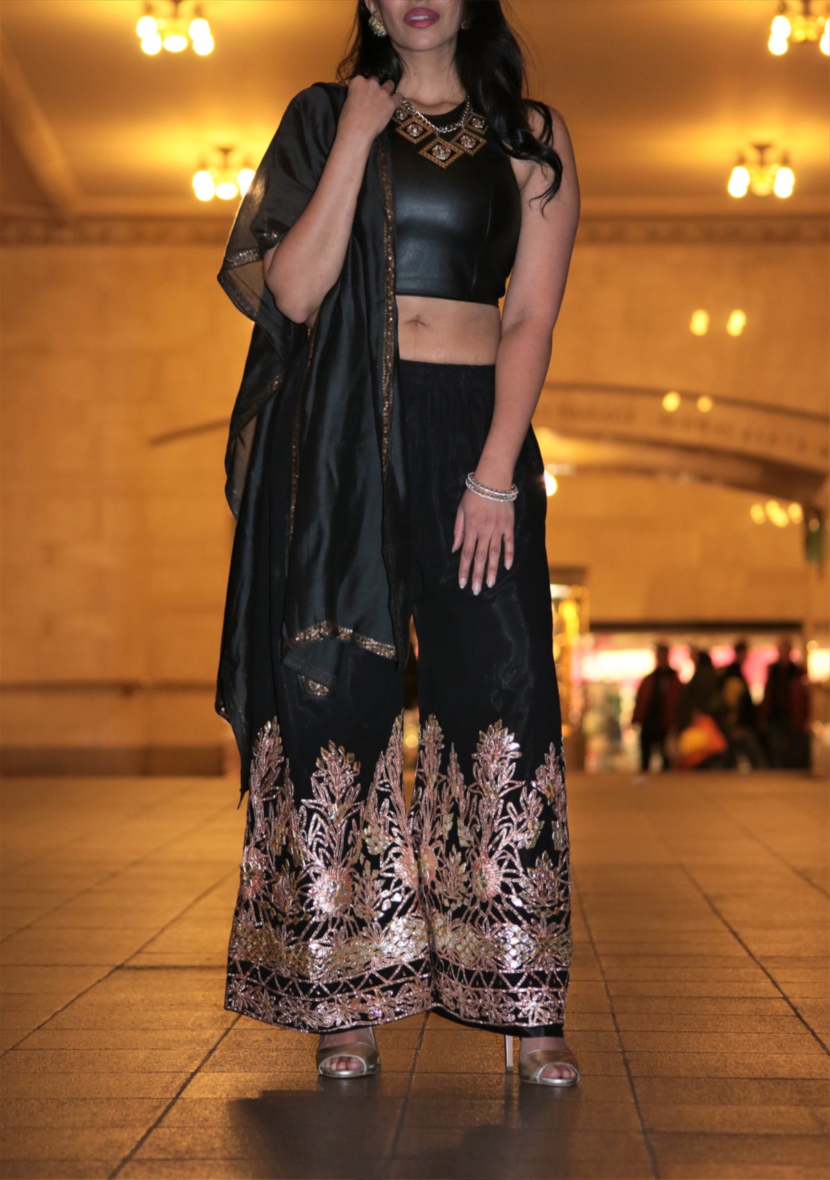PP-21013- Georgette wide leg pants with Kinari embroidery work at bottom. Elastic waist band. Paired with a Leather crop top and a Silk blend shawl with embroidered border. Unique, edgy, modern and chic ensemble to make you stand out at the next Desi party!