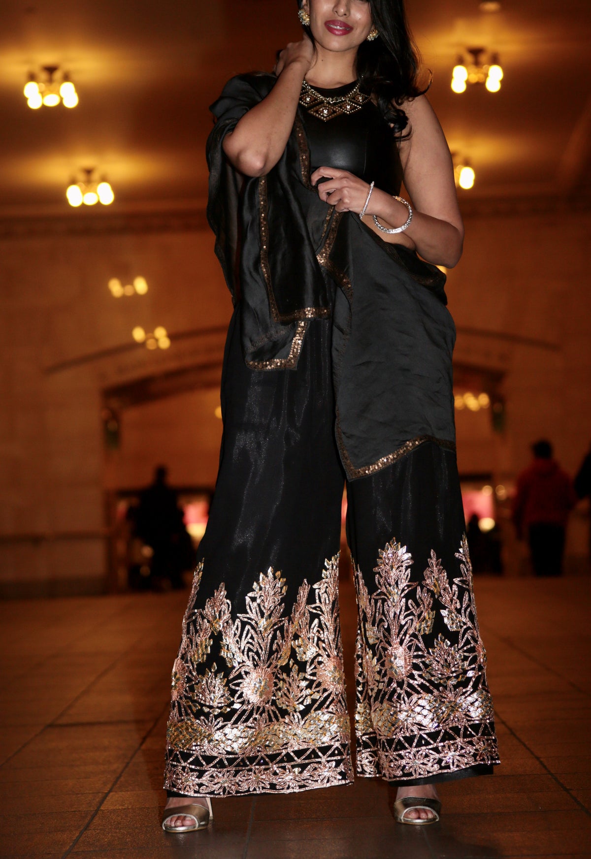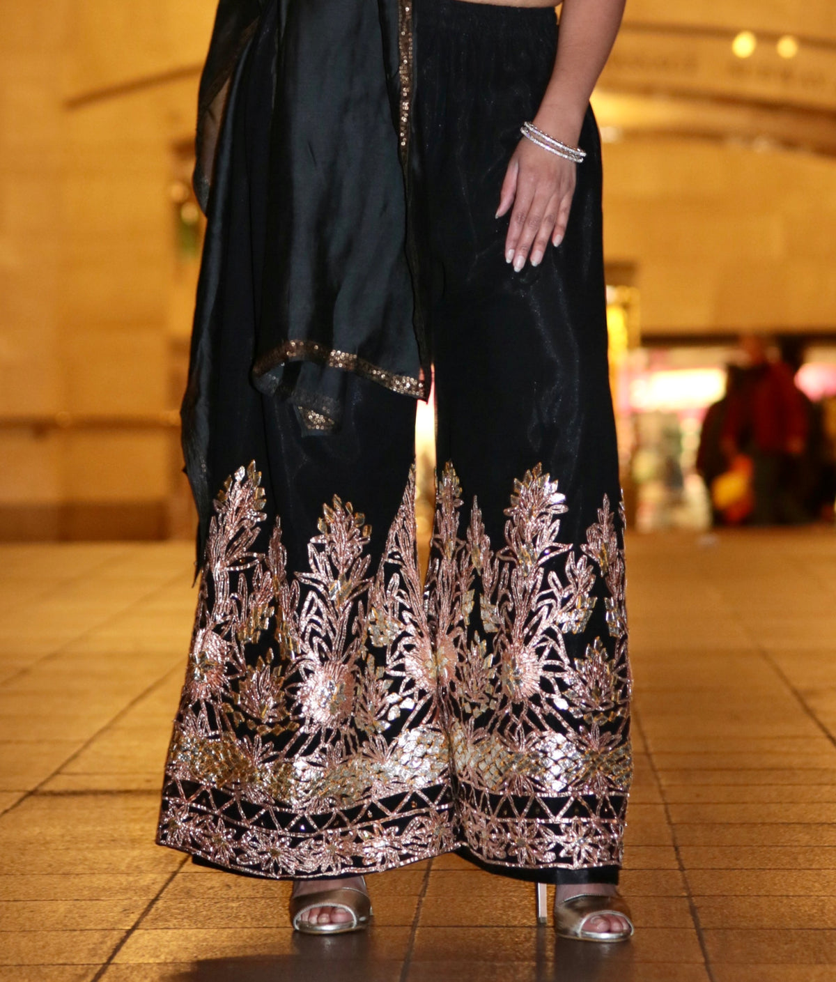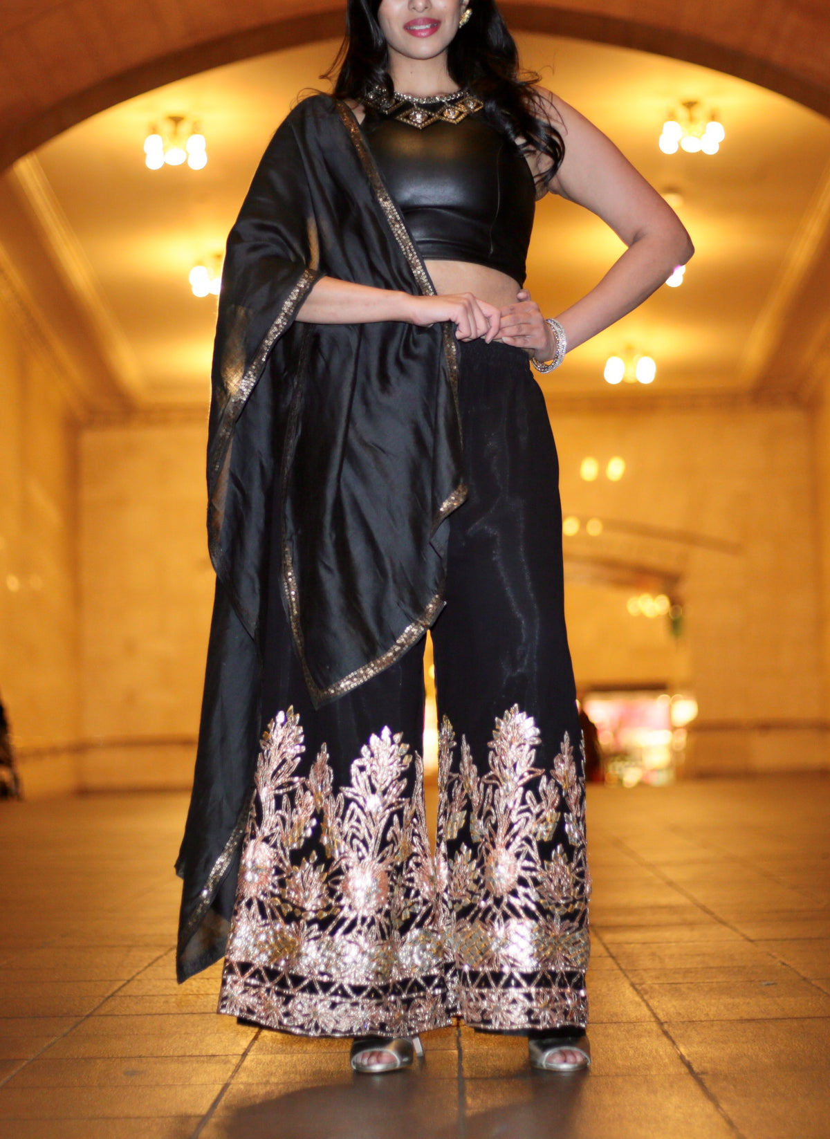 PP-21013- Georgette wide leg pants with Kinari embroidery work at bottom. Elastic waist band. Paired with a Leather crop top and a Silk blend shawl with embroidered border. Unique, edgy, modern and chic ensemble to make you stand out at the next Desi party!